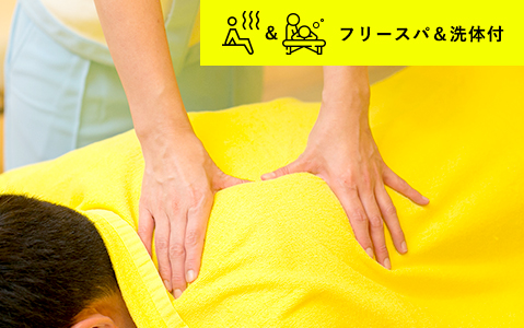 全身施術+特にお疲れの所多めの施術(特にお疲れの所がある方にオススメ)。コースにはフリースパとベッド洗身(背面のあかすり、ボディシャンプー、洗髪)が付いています。